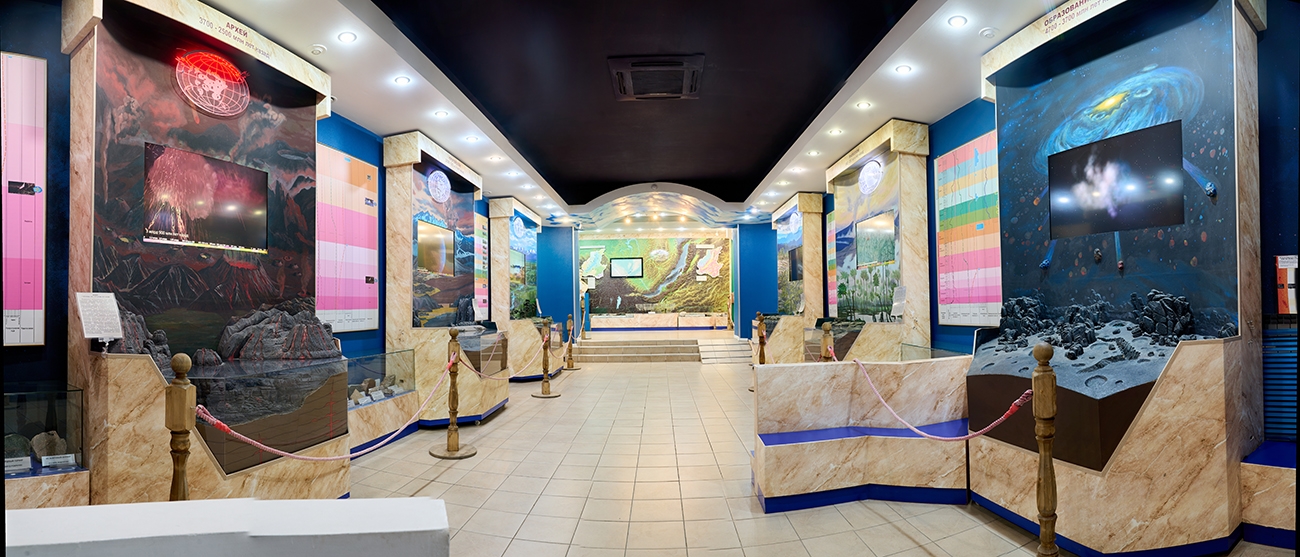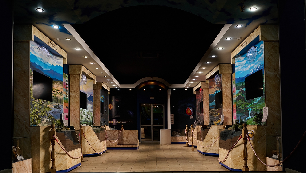 Экспозиция демонстрирует важнейшие этапы развития жизни на Земле, от «большого взрыва» до наших дней, в виде диорам с графическим и анимационным сопровождением, образцами горных пород и минералов, отпечатками древних растений, скелетами животных. Представлены крупные эры геологической истории Земли - Архей, Протерозой, Палеозой, Мезозой, Кайнозой.
