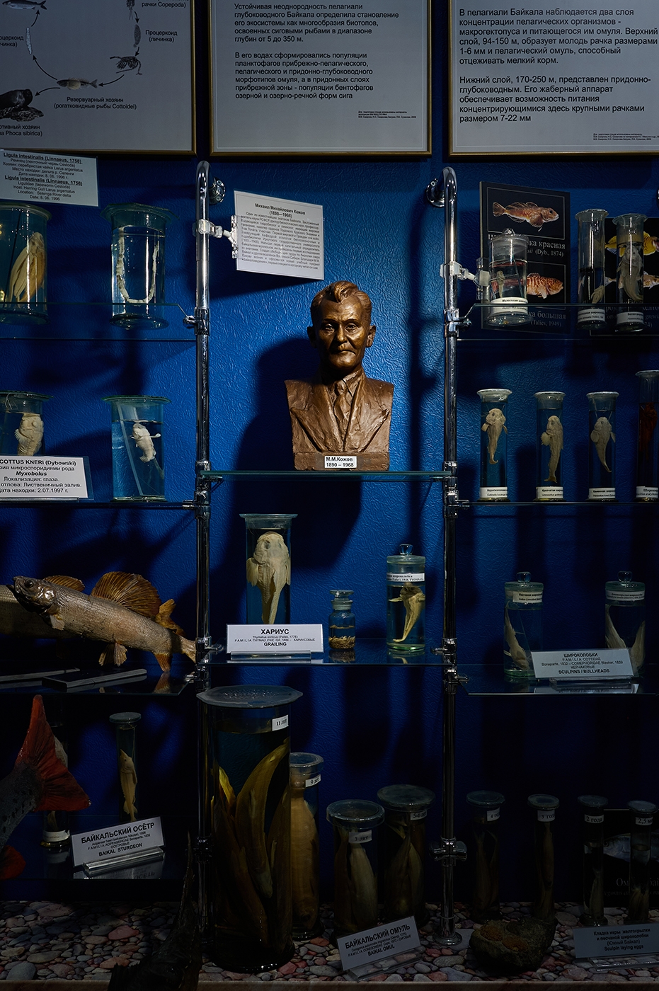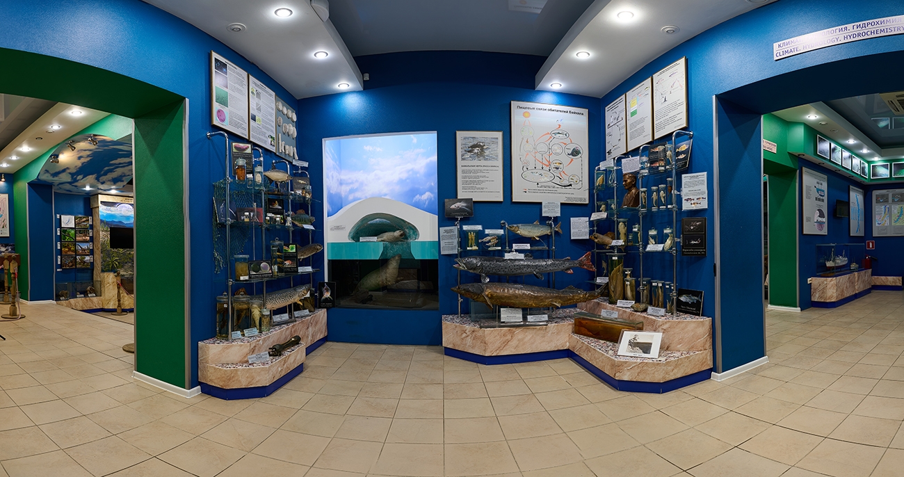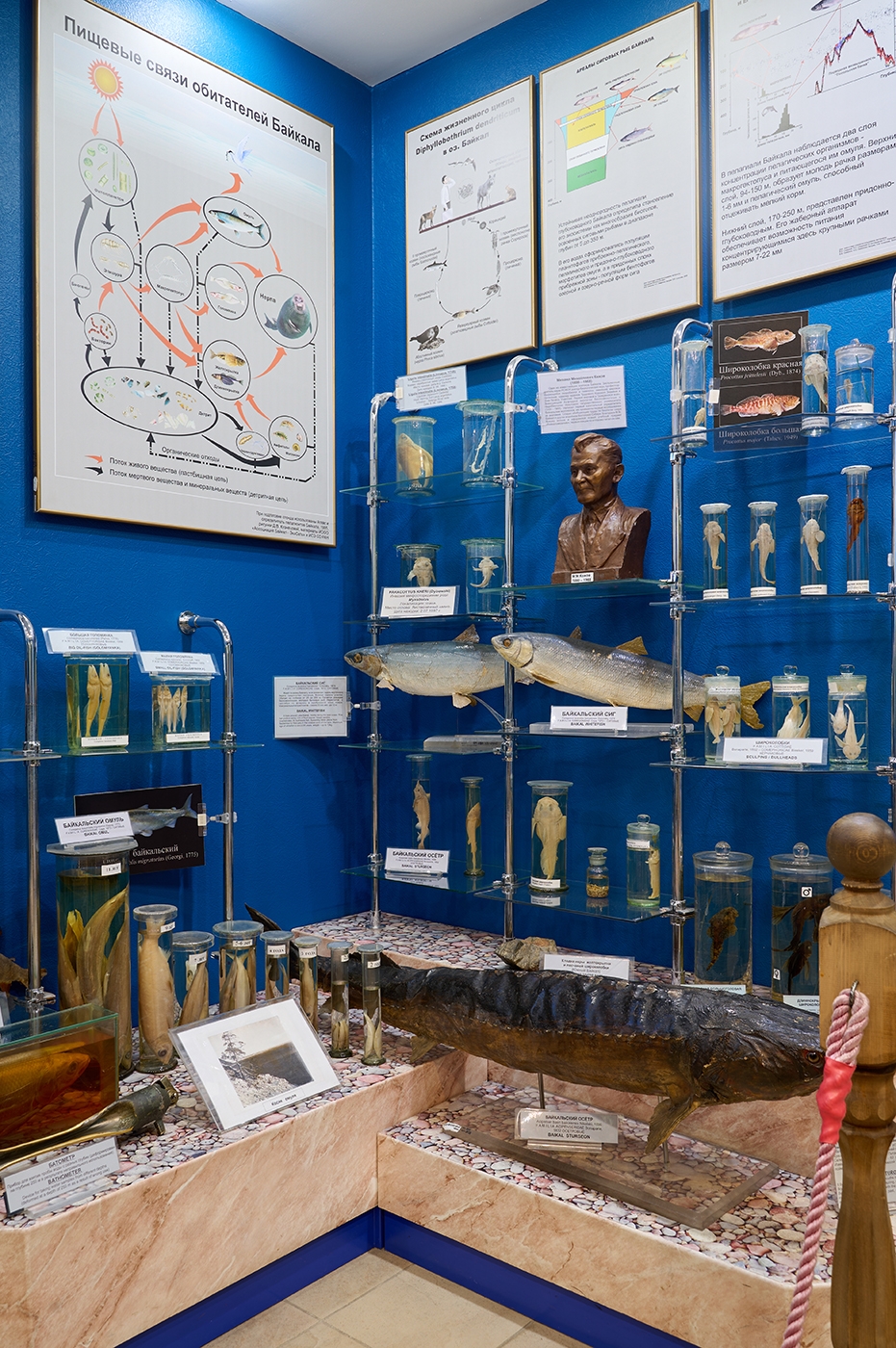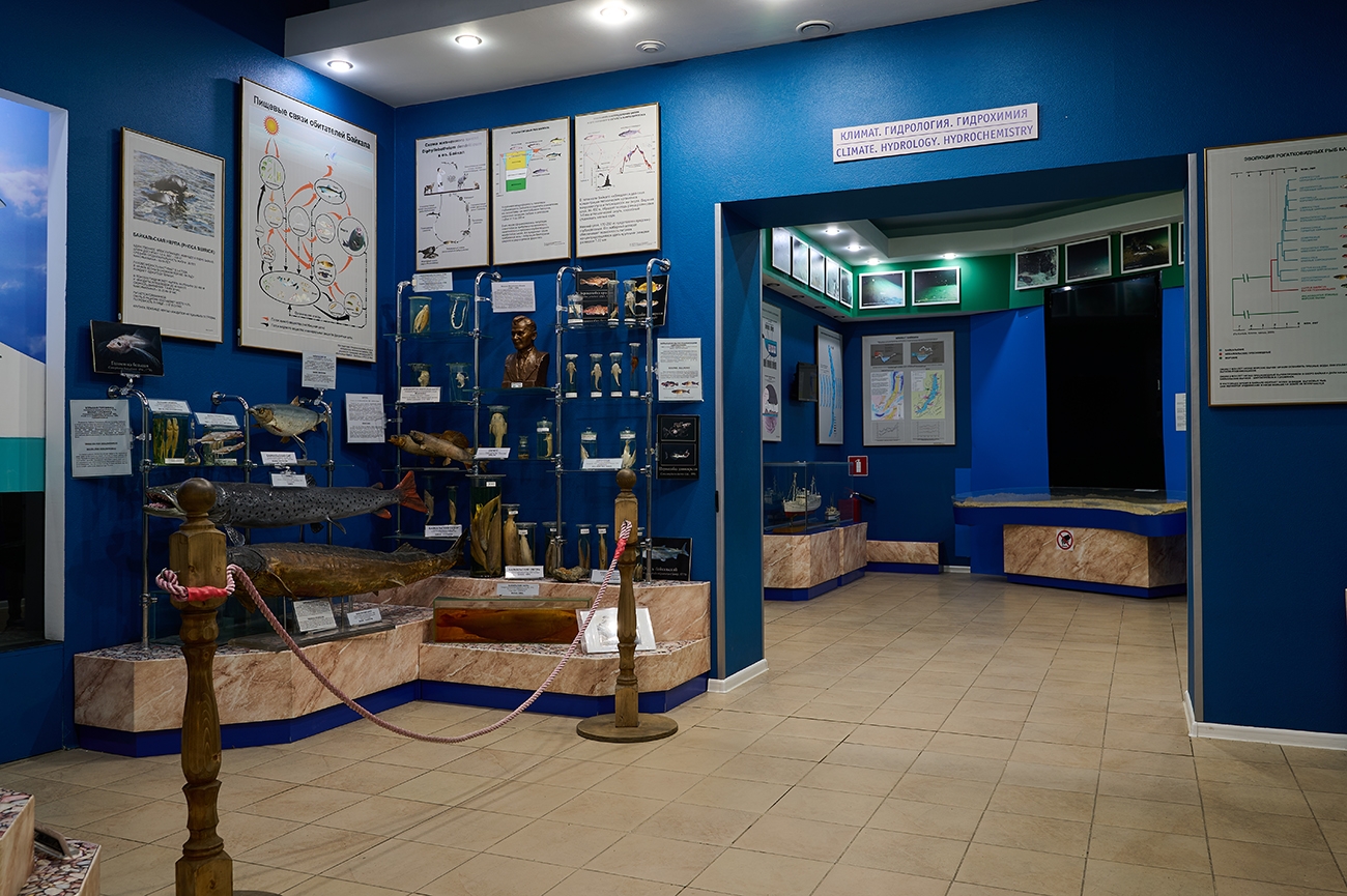 Экспозиция посвящена биологическому разнообразию Байкала. Водоросли представлены в виде увеличенных в сотни тысяч раз выразительных скульптурных моделей наиболее многочисленной и экологически сложной группы диатомовых водорослей. Среди экспонатов интересны представители ихтиофауны. Экспонируются чучела рыб (осётр, таймень, ленок, хариус, сиг, голомянка, щука, окунь,), влажные препараты (голомянка, бычки-подкаменщики, омуль, сазан). Представлена коллекция байкальских высших ракообразных - амфипод (бокоплавов), обитающих, преимущественно, на дне озера. В фиксирующей жидкости находятся единственный вид амфипод, обитающий в толже воды - макрогектопус и микроскопический рачок-фильтратор эпишура. Демонстрируется разнообразие байкальских моллюсков. Создан макет логова нерпы в марте, когда Байкал все еще покрыт льдом. В логове находится нерпёнок-белёк, а в воде подо льдом - самка нерпы. В экспозиции расположены планшеты «Систематический состав фауны озера Байкал», «Эволюция сиговых рыб Байкала», «Эволюция рогатковидных рыб», «Микроорганизмы» и «Водоросли» «Пищевые связи обитателей Байкала», «Схема жизненного цикла Diphyllobothrium dendriticum в оз. Байкал», «Ареалы сиговых рыб Байкала», «Эхограмма распределения омуля».