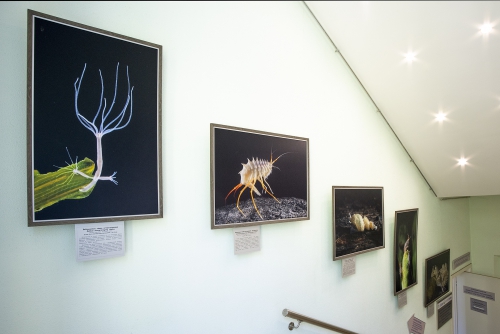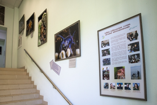 Экспозиция начинается на лестничных пролётах между 2 и 3 этажами музея. Здесь Вы увидите впечатляющие фотографии миниатюрных байкальских животных, снятых крупным планом: бокоплавов, моллюсков, ручейников, рыб... На фото мастерски переданы красота и совершенство этих удивительных существ. А письменные комментарии к снимкам приоткроют завесу над сокровенными тайнами фото-героев. Фотографии проведут Вас с лестницы, по коридору 3 этажа, к уютной аудитории.