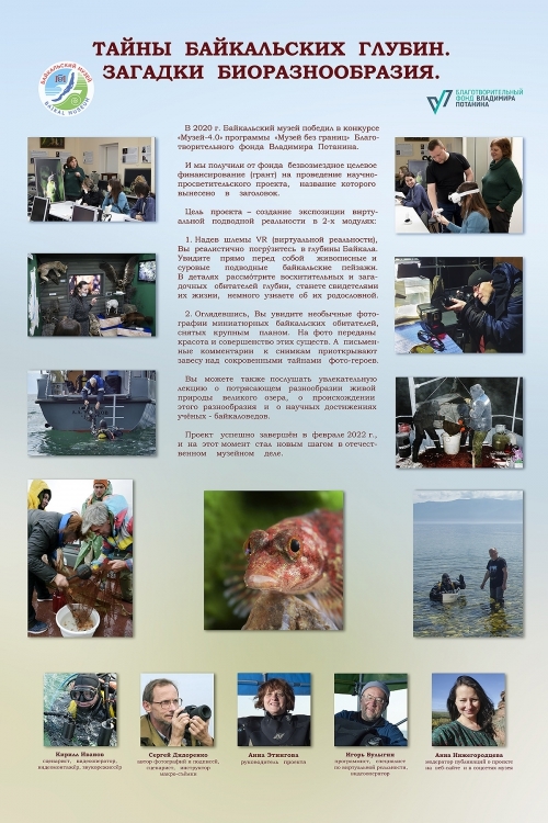 Экспозицию создали сотрудники музея под руководством к.б.н. Анны Этинговой. Вся макро-фотосъёмка и часть макро-видеосъёмки байкальских обитателей – это работа фотохудожника Сергея Дидоренко. Подводные сцены снимал подводный оператор Кирилл Иванов. Он же обрабатывал и монтировал фильм. Программист Игорь Булыгин обеспечивал работу камеры сферического обзора, компьютерных программ, VR-шлемов. Анна Нижегородцева освещала работу группы на веб-сайте музея и в соц-сетях, работала со СМИ.