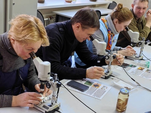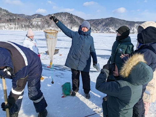 После занятий в Экоцентре и общения с байкальской нерпой в аквариумах музея ребята вместе с сотрудниками музея канд. биол. наук А.А. Этинговой и аспирантом С.П. Веприковым отправились на лед Байкала, чтобы взять из заранее подготовленной проруби биологические пробы планктона. Интегрированную пробу собирали сетью Джеди в столбе воды от 100 м до поверхности воды. Собранных беспозвоночных животных ребята изучали под микроскопами в Экоцентре.
