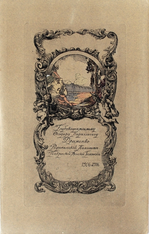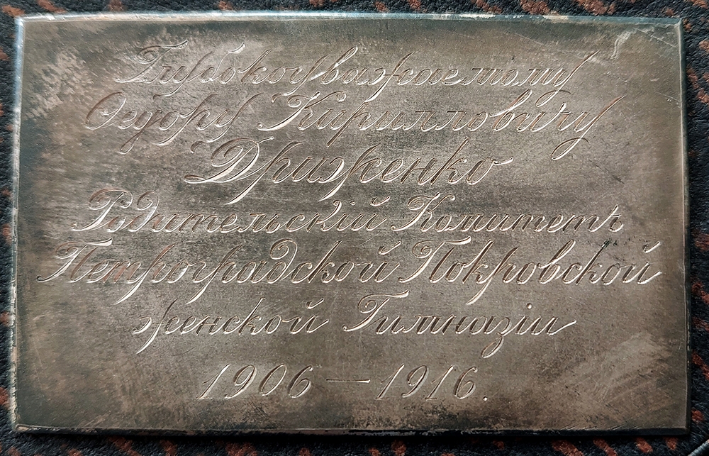 Родители искренне благодарят Федора Кирилловича за эту важную общественную работу и сожалеют о том, что он вынужден покинуть состав Родительского комитета. На последнем созыве в знак уважения Федору Кирилловичу была подарена папка-бювар: «Да будет этот скромный дар знаком благодарности к Вам со стороны ближайших сотрудников Ваших за Вашу плодотворную и многополезную долголетнюю деятельность в Комитете и да напоминает он Вам, как высоко ценили и ценят Вас Ваши сотрудники – представители родителей учениц Гимназии».