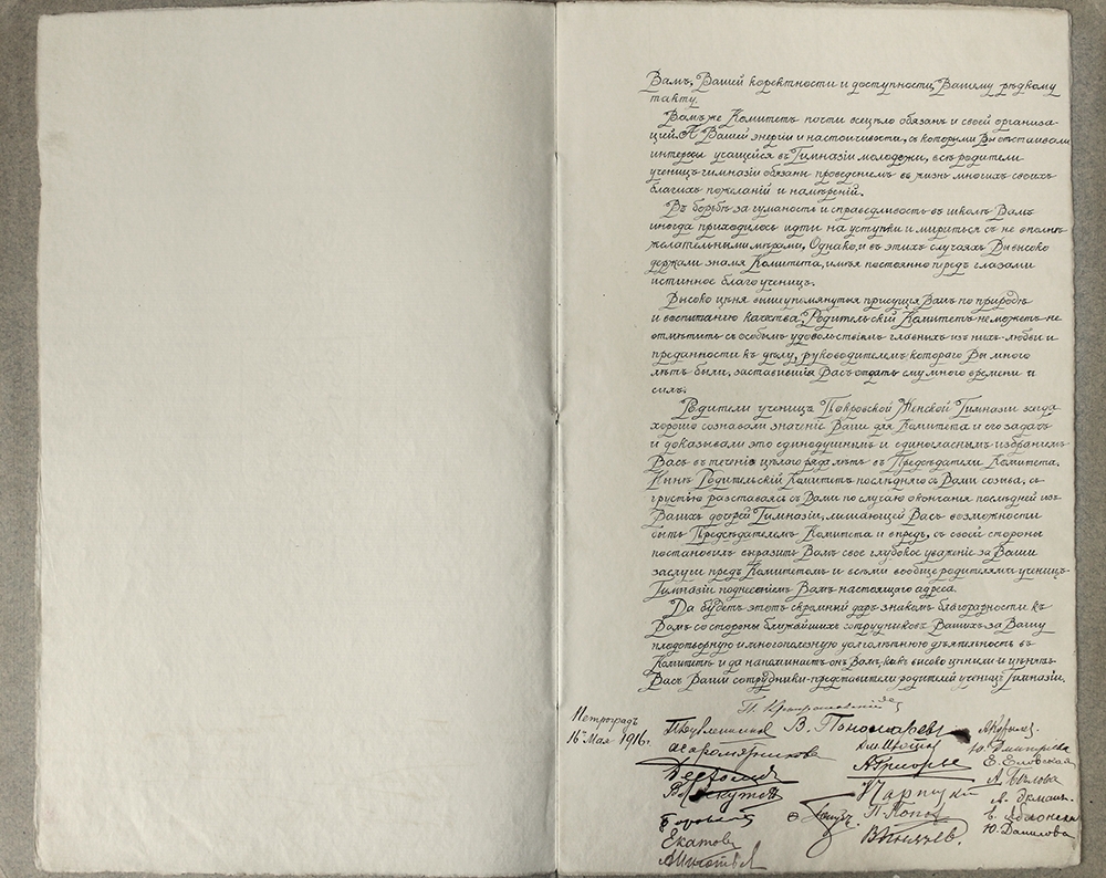 Находящееся в папке письмо – не от Морского или Военного министерства, не от Императорского Русского Географического общества, не от учеников-гидрографов, как можно было предположить, а от … родителей учениц Покровской женской гимназии Санкт-Петербурга. Фёдор Кириллович Дриженко в течение нескольких лет был Председателем Родительского комитета этой гимназии.