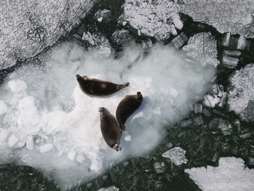 В отличие от 2022 г. ледовая обстановка была совершенно другой. В северной части озера ледовые поля сохранялись дольше. Первые льды, на которых были обнаружены байкальские нерпы, встречены 29 мая в районе бухты Сосновая. Животных было очень много (тысячи). Проведены съемки зверей, лежащих на последних льдах, для оценки их физического состояния (линька, размерно-возрастной состав, упитанность).